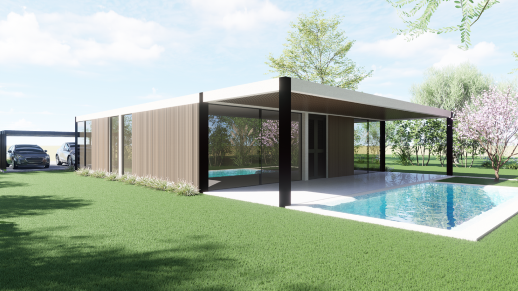 Single-family home fabricated entirely in a workshop, with an A+ energy rating and graywater and rainwater recovery.
